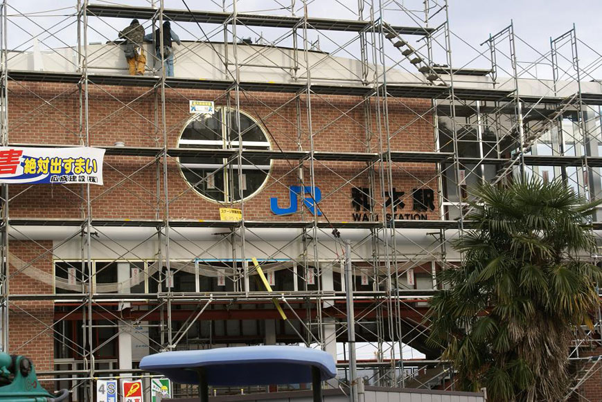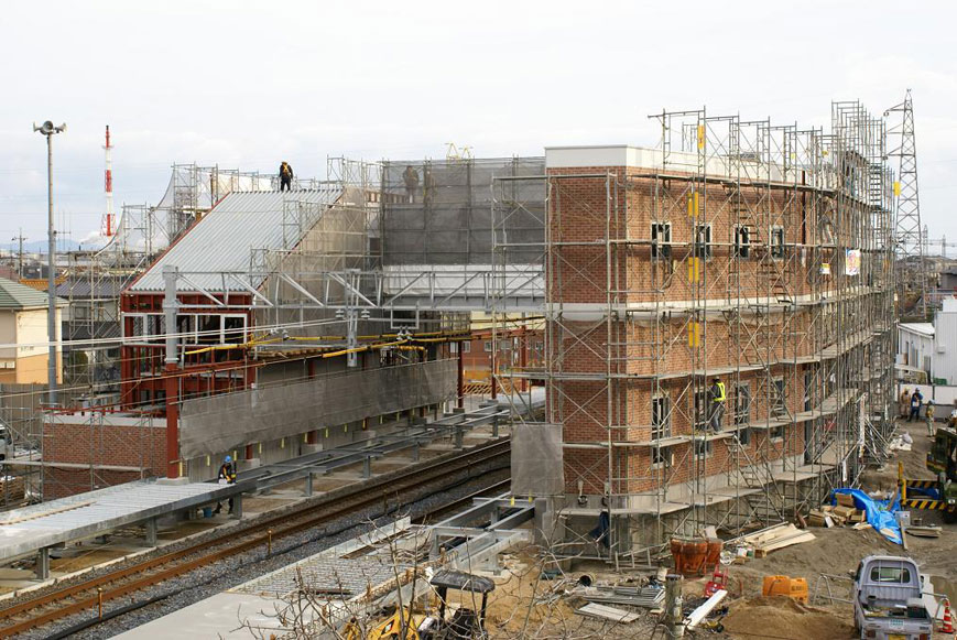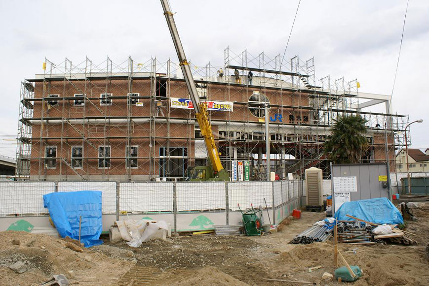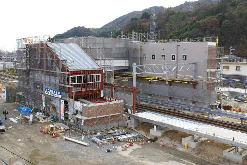 2008年3月15日(土)の開業に向けて着々と建設は進んでいます。西側(山側)には和木町のシンボルマークの○にキの窓がデザインされています。